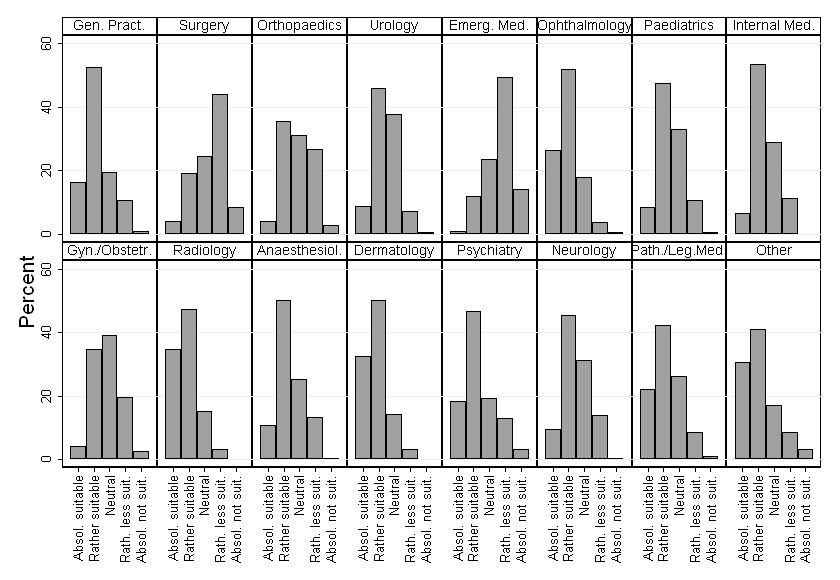 To what extent are different medical specialities suitable to satisfy your work environment expectations? Please assign a value to each option. (Answering options with five descriptors: absolutely suitable – rather suitable – neutral – rather less suitable – absolutely not suitable).