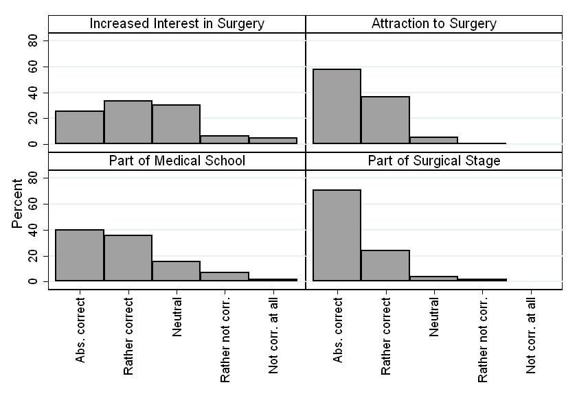 The following aspects apply to the virtual reality (VR) intervention in this study: The VR demonstration has increased my interest in surgery, the VR demonstration increased the attraction of surgery as a career choice, VR demonstrations and exercises should be a formal part of medical school, and the VR demonstrations and exercises should be integrated as formal part of the surgical stage. (Answering options with five descriptors: absolutely correct – rather correct – neutral – rather not correct – not correct at all.)