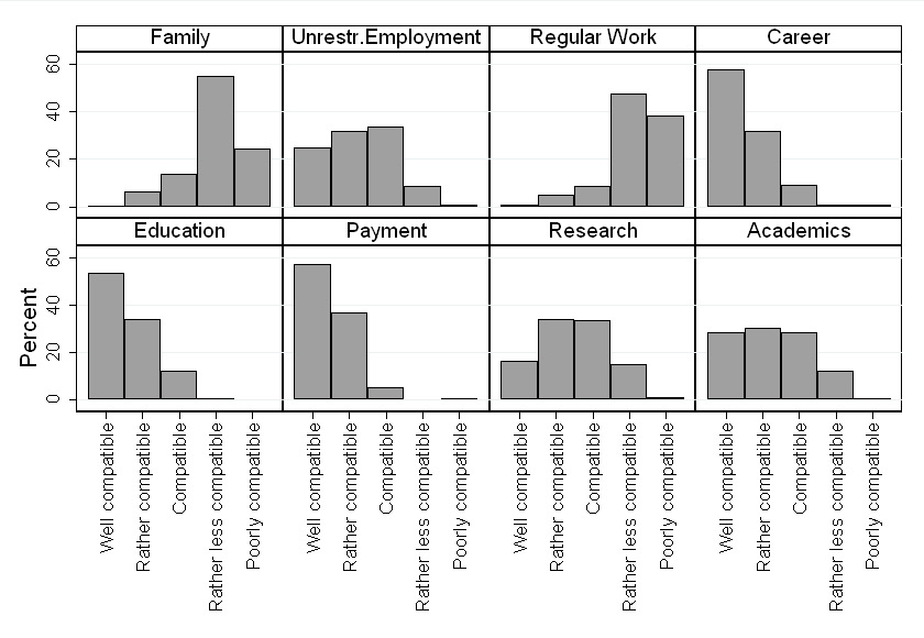 How compatible is surgery with the following aspects of the work environment: good work-life balance (family), unrestricted employment (unrest. employment), regular work, good career chances (career), optimal education (education), adequate payment (payment), possibility for research (research) and option for pursuing an academic career (academics)? Please assign a value to each option. (Answering options with five descriptors: well compatible – rather compatible – compatible – rather less compatible – poorly compatible.)