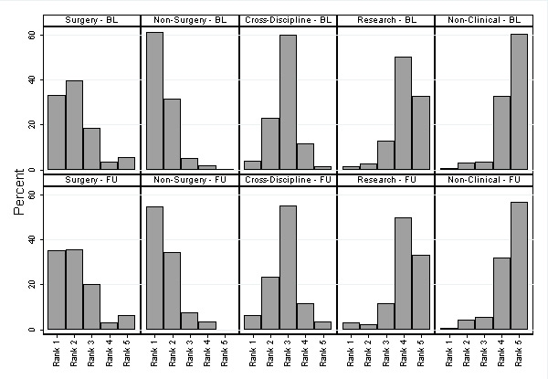 Following the VR intervention, an online questionnaire was sent out (www.surveymonkey.com) on the same day to all students; this included 19 questions regarding baseline characteristics, their expectations concerning future working environments, surgical career aspects, and their feedback on the VR intervention. The students were asked to rank again the five working environments (final ranking). Most items in the online questionnaire were not evaluated in the baseline questionnaire, because their importance was thought not to be related to the VR intervention. To reduce bias, the order of the answering options was randomly generated for each student. In the case of rating scale questions, answering options were labelled with 5 descriptors (e.g., 1 = very important, 2 = rather important, 3 = neutral, 4 = rather less important, and 5 = little important). There was no “not applicable” answering option, in order to force students to provide an answer. It was mandatory to answer all questions in order to be able to send back the questionnaire. If the questionnaire was not answered within a week, a reminder was sent out by e-mail every 7 days, until the study was closed in November 2012. Response to the online questionnaire was kept anonymous in order to increase the response rate. Linking individuals to the preceding short baseline questionnaire was, therefore, not possible.