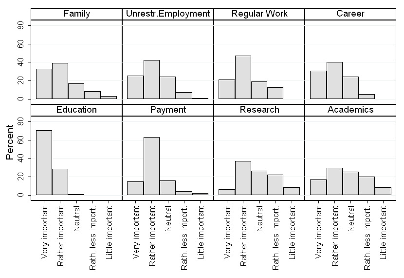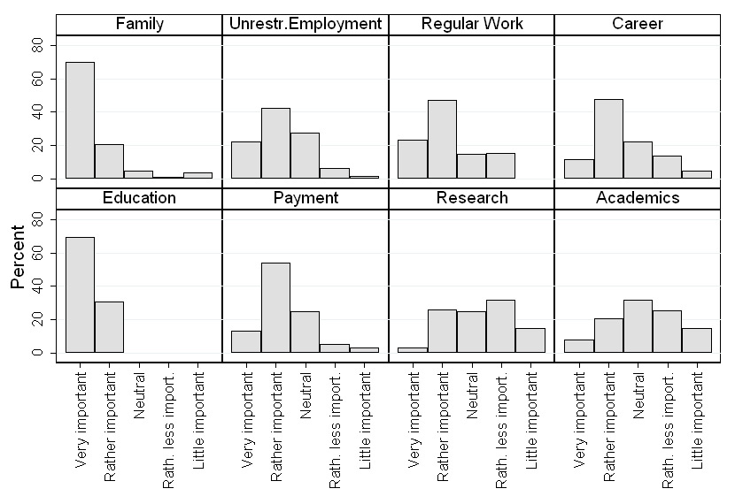 As a doctor, how important are the following aspects regarding future work environments to you: good work-life balance (family), unrestricted employment (unrest. employment), regular work, good career chances (career), optimal education (education), adequate payment (payment), possibility for research (research) and option for pursuing an academic career (academics)?