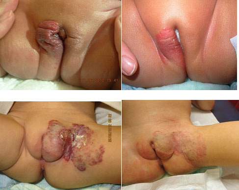 Two examples of genital area haemangiomas complicated by ulceration. Left: before treatment. Right: after treatment with propranolol (2 mg/kg/day).