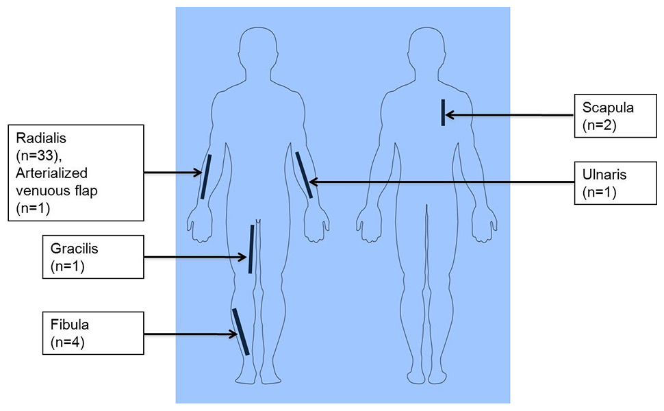 Overall, 31 patients underwent radial forearm flaps (77.5%), 3 patients had fibula flaps (7.5%), 2 patients had scapula flaps (5.0%), 1 patient received an arterialised venous flap of the forearm (2.5%) and 1 patient received a gracilis muscle flap (2.5%). One patient received both fibula and radial forearm flaps simultaneously (2.5%) and one patient received radial forearm flap and secondary ulnar forearm flap as a consequence of flap necrosis (2.5%) (fig. 1).