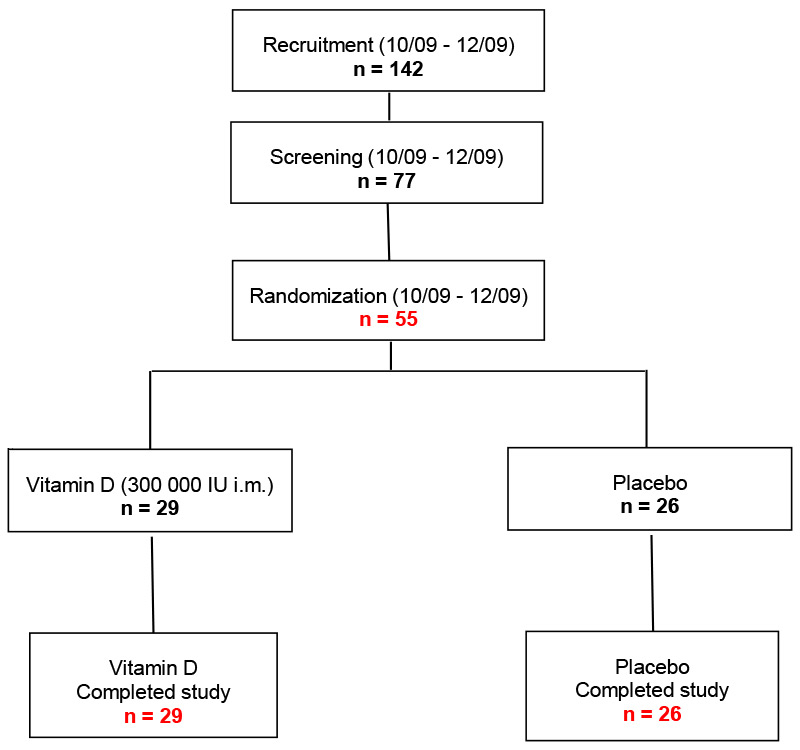 A total of 142 patients with T2DM were recruited between October and December 2009, 77 were screened and 55 fulfilled the entry criteria, consented and were enrolled into the study (n = 29 to D3, n = 26 to the placebo group, (fig. 1). Baseline characteristics of the study subjects are summarised in table 1. There were no significant differences between the two treatment groups at baseline (table 1, p-values). All of the 55 study participants completed the study (fig. 1) and there was no change in either antihyperglycaemic drugs (insulin requirements) nor in the number and dose of antihypertensive drugs.