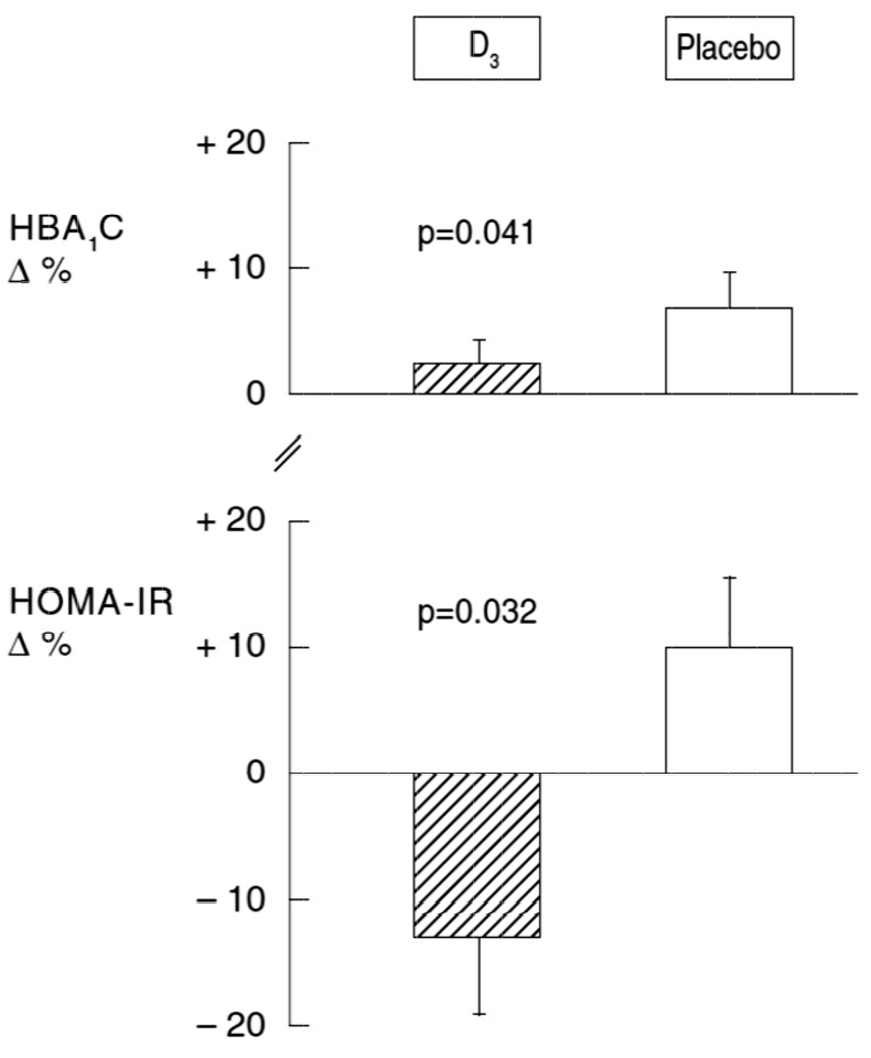 In summary and conclusion, D3 improved insulin sensitivity (based on HOMA-IR) and affected the course of HbA1c positively compared to placebo in patients with T2DM, but did not weaken, and was well tolerated.