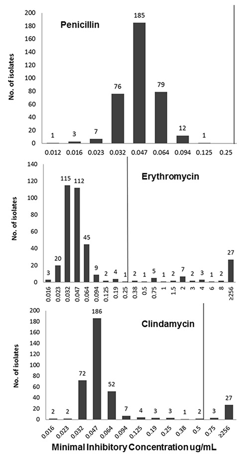 Minimum inhibitory concentration distributions of penicillin, clindamycin and erythromycin.