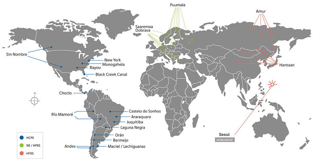 Hantaviruses can cause two distinct illnesses in humans: haemorrhagic fever with renal syndrome (HFRS) caused by so-called “Old World hantaviruses”, or hantavirus cardiopulmonary syndrome (HCPS) caused by “New World hantaviruses”. Figure 1 demonstrates the geographical distribution of pathogenic hantaviruses and principal associated pathologies in humans.