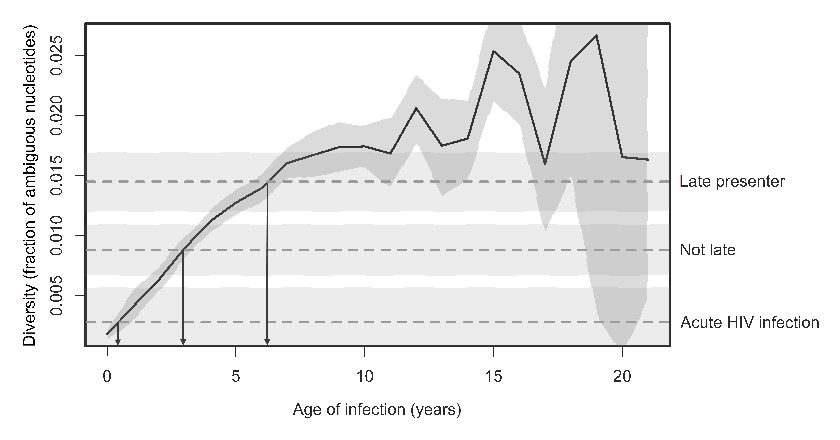 Relationship between the year of infection and the fraction of ambiguous nucleotides. The solid black line represents the mean fraction as a function of the age of infection, where data points have been binned according to the age of infection in years (n = 3,307 patients). (Figure adapted from [18] Roger D. Kouyos et al.: Ambiguous Nucleotide Calls From Population-based Sequencing of HIV-1 are a Marker for Viral Diversity and the Age of Infection, Clinical Infectious Diseases, 2011, 52(4):532–539, by permission of Oxford University Press.) The dashed horizontal lines depict the mean fraction from the three groups of our study and the shaded area represents the 95% confidence intervals. The three arrows from the intersections of the curve with the horizontal lines point to estimated durations of HIV infection of approximately 6, 3, and <1 years for the three groups.