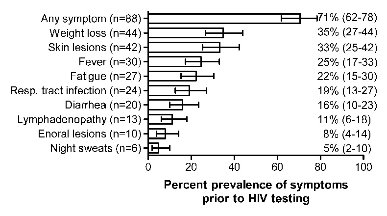 Prevalence of symptoms prior to the HIV test among the 125 late presenters. Error bars represent the 95% exact binomial confidence intervals.