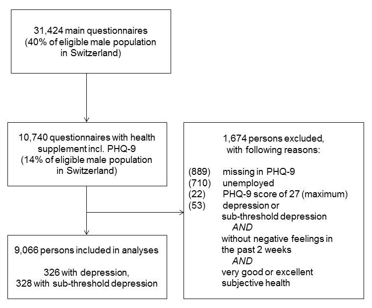 We excluded unemployed persons because one of our primary research questions referred to job-related circumstances. We also excluded from further analyses persons with one or more missing values in the variable of interest for analyses of associations. For persons with a valid depression score, we excluded those with the highest possible score. Persons with depression but without negative feelings in the past 2 weeks and a (at least) very good subjective health status were also excluded from further analyses since this pattern of answers is implausible. Overall, 0.75% of the sample was excluded for such reasons. We based all analyses on a sample of 9,066 persons. Figure 1 shows the sample recruitment.