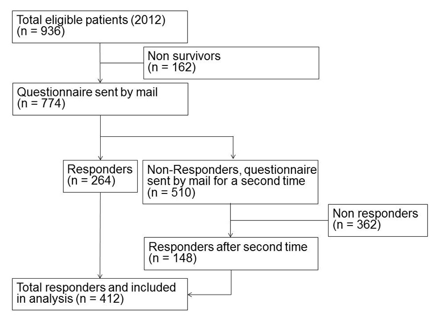 Patients who died during the hospitalisation or were under the age of 16 years were excluded. Patients hospitalised several times at the same study centre during the same study period in 2011 or 2012 were analysed on first admission and excluded in all further admissions because of potential recall bias.