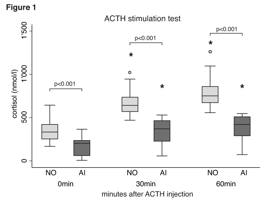 Cortisol values immediately before (0 min = baseline) and 30 minutes (30 min) and 60 minutes (60 min) after ACTH injection. Patients with adrenal insufficiency (AI) are plotted in dark grey; patients with normal adrenal function (NO) are plotted in light grey. * p <0.001 for comparison with baseline values.
