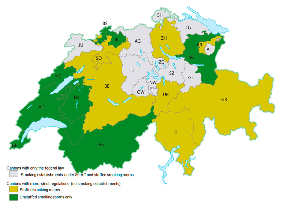 Fortunately, Swiss direct democracy offers political tools to improve its policies. Namely, cantons (political and administrative subdivisions of Switzerland) can adopt stricter laws. When the national smoking ban came into force, 15 out of the 26 cantons already had stricter laws, and 8 of them had nearly comprehensive smoking bans with as sole exception the possibility for public establishments to have a dedicated smoking room of limited size and without service (fig. 1). Another tool at the disposal of the population is the ballot initiative which allows citizens to demand that a modification of the Swiss Constitution be put to a popular vote.