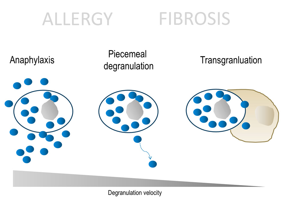 It is obvious that the dynamic of mast cell degranulation in fibrogenic reactions differs from anaphylaxis. In IgE-mediated anaphylaxis, literally all vesicles are released from the mast cells within minutes to a few hours (fig. 1). The classical clinical picture is anaphylactic shock with hypotension, bronchoconstriction and exanthema. Non-IgE driven anaphylactoid reactions that cause rapid mast cell degranulation e.g., by staphylococcal toxins or contrast reagents also occur [6]. Probably more frequently, and associated with more subtle symptoms, mast cell vesicles can be released by a slower process called piecemeal degranulation [7] where vesicles can traffic through the interstitial space via lymphatic vessels to distant lymph nodes [8]. Piecemeal degranulation can therefore be regarded as paracrine and even endocrine mechanism of mast cells to initiate immune reactions and possibly also to support fibrosis. A third even less discussed mechanism is the direct release of vesicles to another cell by cell-cell contact, called transgranulation.