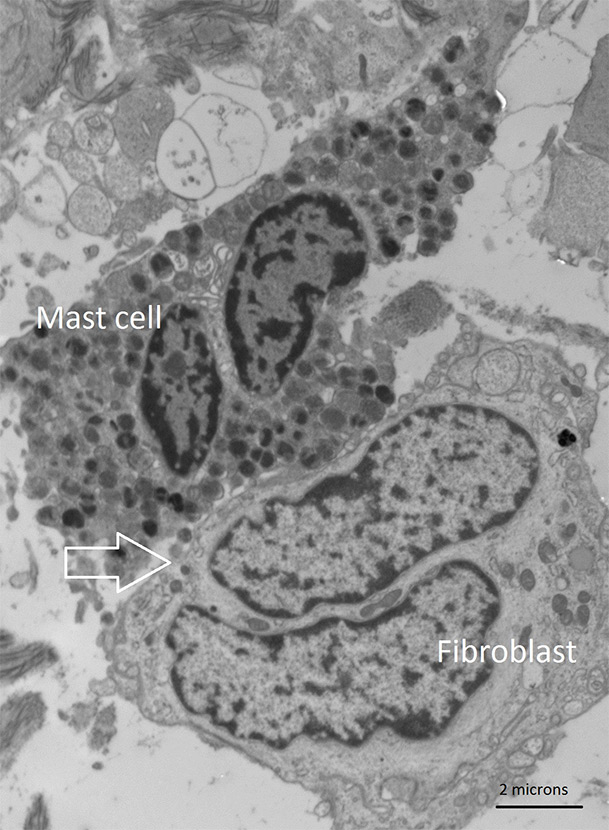Transmission electron microscopy of the dermis in a patient with systemic sclerosis. The image shows cell-to-cell contact between a mast cell and a fibroblast with transgranulation (arrow).