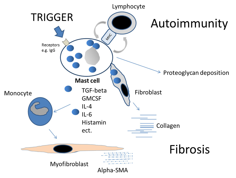 Mast cells are natural biosensors of the interstitial tissue orchestrating vasotonus and extracellular matrix turn-over. Slow release of mast cell vesicles with profibrotic cytokines and growth factors induce collagen expression in fibroblasts. Transgranulation via cell-cell contact seems to underline this phenomenon. Mast cells also interact with other immune cells such as monocytes or lymphocytes and monocyte differentiation into myofibroblasts has been described in SSc. Activated mast cells also release proteoglycans as direct matrix components. Therefore, fibrosis could be regarded as unspecific result of chronic mast cell activation rather than being specific for one disease. Further studies are necessary to understand this vesicle transport and, more importantly, to identify triggers for mast cell degranulation to develop new efficient treatment options.