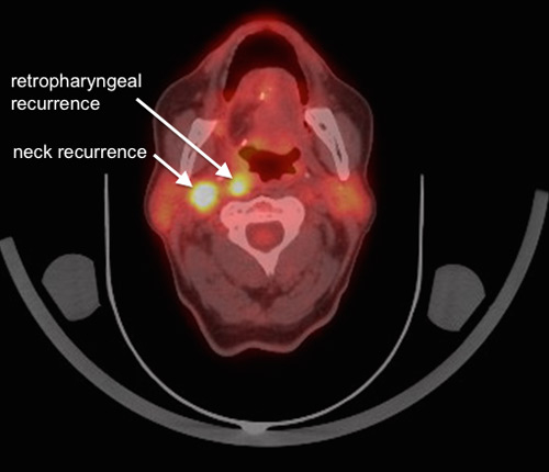 The same follow-up 18F-FDG-PET/CT scan showing the fused 18F-FDG-PET part with the CT part. There is no evidence for local recurrence at the reconstruction site however there are two highly suspicious lymph nodes in level IIb ipsilateral and retropharyngeal.