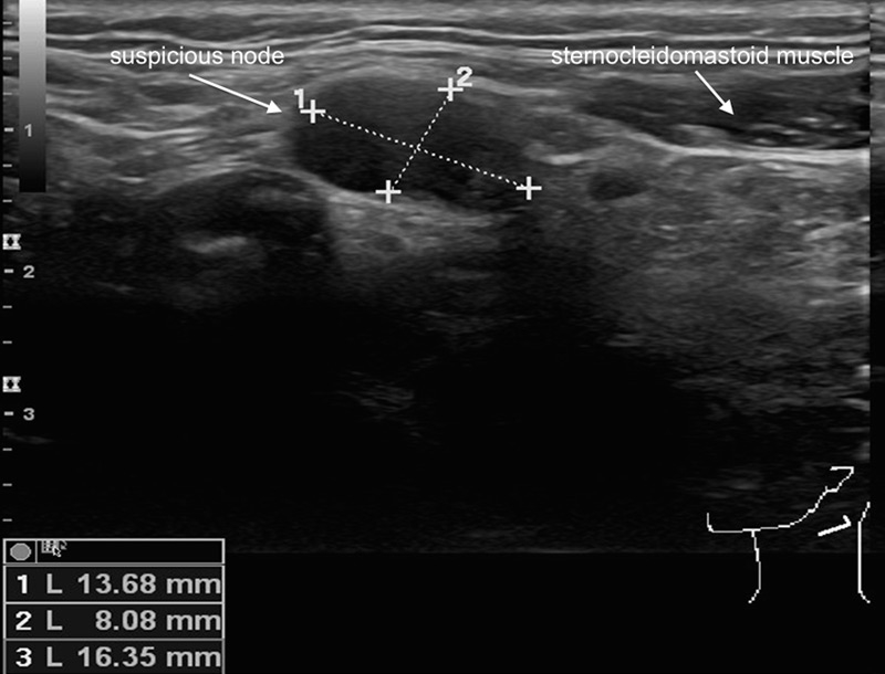 Sonographic appearance of a suspicious lymph node on palpation in level II left from a patient with a small squamous cell carcinoma of the right lateral tongue. The absence of an echogenic hilus, the size of more than 1.5cm and the shape of the lymph node renders it sonographically suspicious. The cytology result after ultrasound-guided fine needle aspiration confirms the presence of a contralateral positive node.