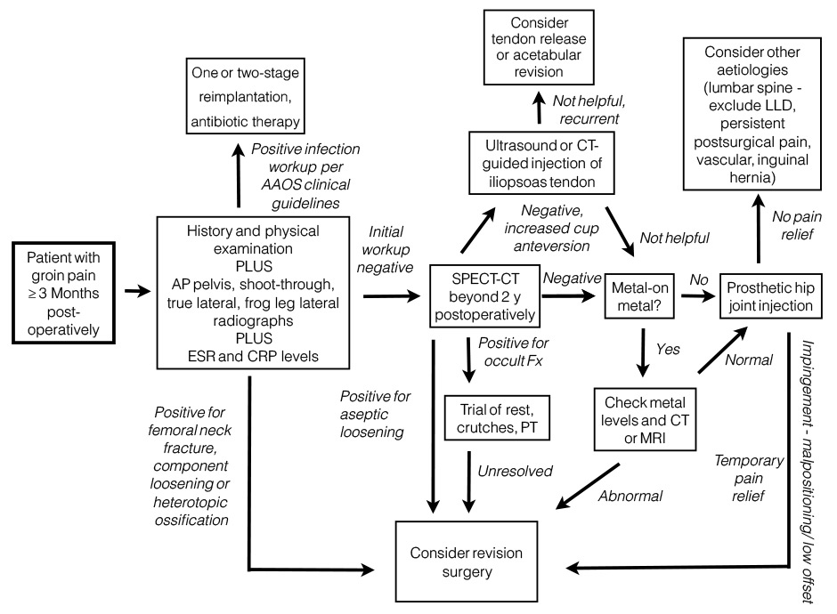 Diagnostic algorithm for groin pain after total hip replacement [93, 94].