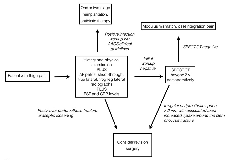 Diagnostic algorithm for thigh pain after total hip replacement (based on the American Academy of Orthopedic Surgeons Clinical Practice Guideline) [ 94].
