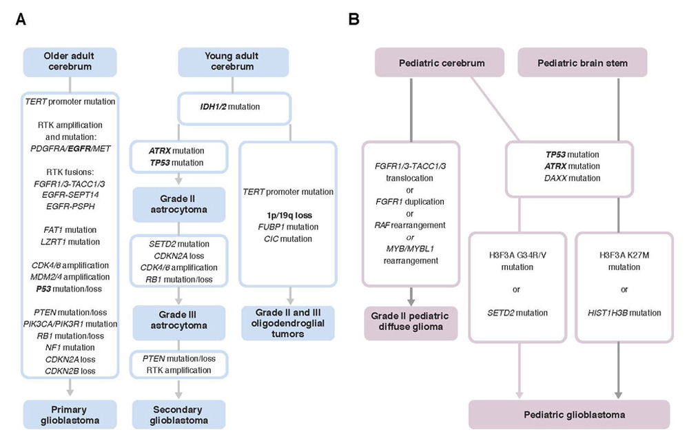 Genomic alterations underlying the development of gliomas. (A) Gliomagenesis in adults. Secondary glioblastomas (10% of cases) affect younger individuals and develop over a long period of time from lower-grade astrocytomas. Almost all cases are characterised by a mutation in IDH1/2,and a majority has mutations inATRX. Primary glioblastomas (90% of cases) occur in older individuals and do not have a known precursor lesion. Almost all cases are wild-type for IDH1/2andATRX. Oligodendrogliomas are characterised by mutations in IDH1/2, wild-type ATRX, and loss of 1p/19q. (B) Paediatric gliomagenesis is molecularly distinct. Low-grade tumours are characterised by a single genetic event affecting FGFR, MYB/MYBL1 or RAF. Paediatric glioblastoma hallmark mutations target H3F3A at different residues, depending on tumour location. See text for gene abbreviations. In bold are highlighted proteins routinely tested to guide diagnosis. In addition to this, MGMT promoter methylation is frequently tested for therapeutic decisions (see text). Larger panels of genetic mutations are screened in clinical trials.