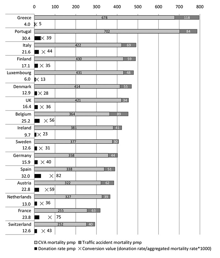 In order to evaluate the potential for organ donation, two studies compared mortality rates from CVA and traffic accidents with actual donation rates in different countries [7, 61]. Both studies found considerable differences between the mortality rates in the countries included in their analyses. Since in our study, 83.0% of the UTID died of either CVA (62.8%) or traumatic brain injury (20.2%), we wanted to compare mortality rates from these diagnoses with donation rates in selected European countries. Assuming that traumatic brain injuries were mostly resulting from traffic accidents, we extracted CVA and traffic accident mortality rates from the Eurostat statistics database (ICD-10 I60–69 and V01–99; age standardised, 2010 data or nearest year for EU 15 countries and Switzerland) [62]. The donation rates for these selected countries were taken from the International Registry in Organ Donation and Transplantation (IRODaT) [63].