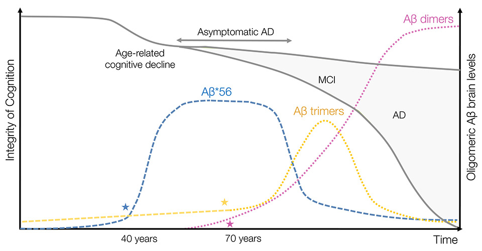 Revised model of endogenous oligomeric Aβ brain levels in aging and Alzheimer’s disease. In this model limited to three readily detectable oAβ in human brain tissues (i.e., Aβ dimers, trimers and Aβ*56), Aβ*56 is the first assembly to rise abnormally in midlife coinciding with subtle age-related cognitive decline although Aβ trimers are the first soluble species expressed by neurons. This scenario implies that energetic requirements for forming Aβ*56 are relatively low. The high expression levels of Aβ*56 in the brain are sustained over decades possibly contributing to early disruption in neuronal physiology and to the long silent asymptomatic phase of AD. Concomitant to a lowering of brain levels of Aβ*56, Aβ trimers accumulate transiently during the initial stage of the symptomatic phase of AD, MCI. This sequence implies that Aβ trimers are indeed the molecular building block of Aβ*56 and that the putative cofactor responsible for sustaining Aβ*56 production declines with disease progression/aging. With the emerging accumulation of prefibrillar and fibrillar Aβ assemblies, brain levels of “trimer-based” oligomers (i.e., Aβ*56 and Aβ trimers) decline with disease progression. In this setting, Aβ dimers contribute to the local toxicity in the vicinity of amyloid plaques, finishing off neurons that might have resisted the toxic waves induced by Aβ*56 and Aβ trimers. Stars (★) indicate the ages at which statistically significant changes in the respective levels of oAβ were observed.