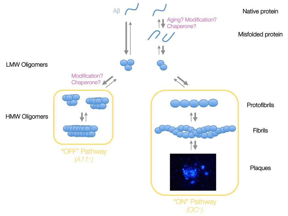 Proposed model of Aβ aggregation. In this model, natively folded Aβ monomers preferentially form Aβ trimers under physiological conditions, whereas dimers are formed following the misfolding of Aβ monomers induced by aging, post-translational modification of the primary sequence of Aβ or a chaperone protein. Both Aβ assemblies constitute the pool of low molecular weight (LMW) or low-n oAβ from which two pathways emerge. The “Off” pathway does not lead to the formation of insoluble fibrillar amyloid and is characterised by its immunoreactivity to the conformation-specific oligomer antibody A11. By contrast, the “On” pathway promotes the formation of fibrillar Aβ and molecules involved in this pathway are immunopositive to the conformation-specific fibril antibody OC. Once a species of Aβ has entered one of these paths, it cannot effectuate a horizontal transfer into the opposite pathway but instead it must de disassembled back into a monomeric state. The thickness of arrows illustrates the favoured direction of the putative equilibrium suggested by integrated experimental observations.
