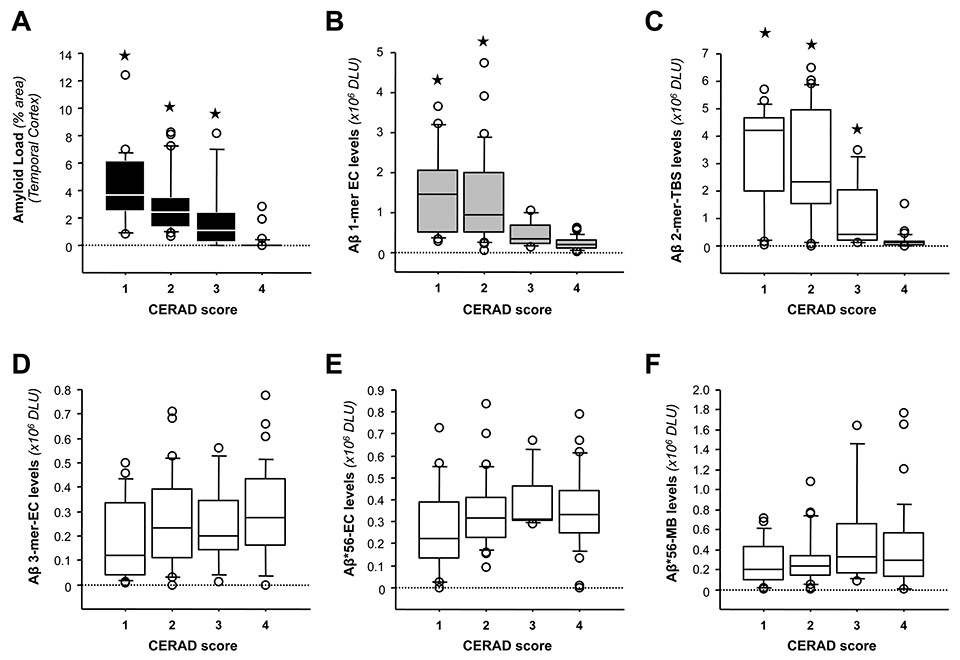 Relationships between specific Aβ oligomers in the brain and CERAD scores. (A-B) Relationships between CERAD scores and amyloid load in temporal cortex (A) and soluble Aβ monomers detected in EC fractions (B). CERAD scores: 1, Definite AD; 2, Probable AD; 3, Possible AD and 4, No AD. (C–F) Relationships between CERAD scores and the levels of various oligomeric Aβ species, including Aβ dimers in TBS extracts (C), Aβ trimers in EC fractions (D), and Aβ*56 in EC (E) and MB (F) lysates. (★ p <0.05 vs. the CERAD score 4 group using Kruskal-Wallis test followed by Mann-Whitney U test with Bonferroni corrections). Abbreviations: EC: extracellular-enriched, MB: membrane-enriched; TBS: Tris Buffered Saline; DLU = densitometry light units.)