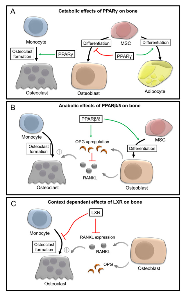 Role of PPARγ, PPARβ/δ and LXRs during the control of osteoblast and osteoclast differentiation. (A) Catabolic effects of PPARγ on bone homeostasis are attributed to the PPARγ-mediated promotion of osteoclast differentiation and its inhibitory role during the differentiation of mesenchymal stem cells (MSC) into osteoblasts. (B) PPARβ/δ exert its anabolic effects on bone homeostasis via promotion of the osteoblast differentiation and regulation of the RANKL/OPG ratio thereby indirectly influencing osteoclastogenesis. (C) During states of increased osteoclastogenesis and high bone turnover such as inflammation and osteoporosis, activation of LXRs is able to both directly and indirectly interfere with osteoclast differentiation via blockade of osteoclastogenesis and influencing the RANKL/OPG ratio.