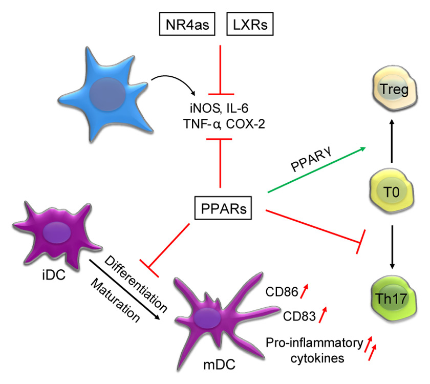 Summary of the key findings on the role of the PPAR, LXR and NR4a family of NRs during inflammation and immune homeostasis. A common feature of these families of NRs are their anti-inflammatory effects that result in the inhibition of the expression of multiple pro-inflammatory cytokines such as inducible NO-Synthase (iNOS), TNF-α, Interleukin-6 (IL-6) and cyclooxygenase-2 (COX-2). PPARs were additionally described to block the maturation of dendritic cells (DCs), which includes an attenuated expression of DC maturation markers such as CD86 and CD83 after activation of this NR sub-family. Also differentiation of T cells into distinct subsets was shown to be influenced by NRs, where PPARs interfere with the differentiation of Th17 cells and simultaneously promote the differentiation of regulatory T cells (Treg).