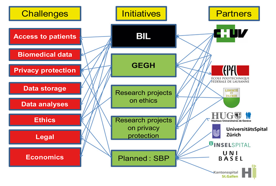 Selected challenges associated with the construction of a bio-resource like the BIL are listed on the left-hand side. Partners in addressing these challenges are listed on the right-hand side and the BIL and parallel projects are listed in the middle. GEGH = Groupe d’Experts sur le Génome Humain (http://www.vd.ch/actualite/articles/experts-en-medecine-genomique/). SBP = Swiss Biobanking Platform, at the planning stage. An overview of the local activities on the societal aspects of genomic medicine, ethics, privacy protection and personalised medicine is provided in references [17–19] and [7].