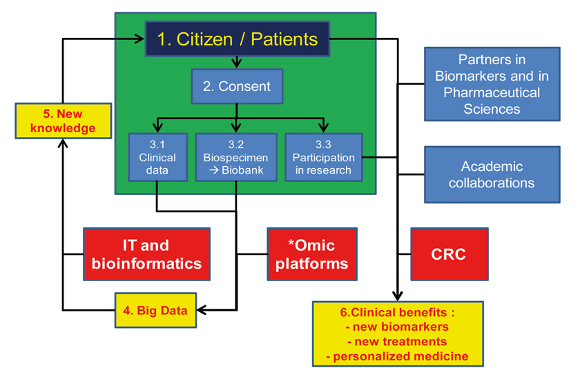 Emerging *omic technologies (genomics, transcriptomics, metabolomics and others) require access to high-quality data and samples from large number of individuals engaged in research and properly consented for the use of their data and specimen. These technologies generate large amounts of data (i.e. Big Data), which are converted into new knowledge thanks to information technology (IT) and bio-informatics. For their clinical utility to be demonstrated, evidence needs to be built, using clinical research on engaged citizens and in partnership with other academic groups within the private sector. The perimeter of the BIL is illustrated using the green rectangle. CRC = clinical research centre.