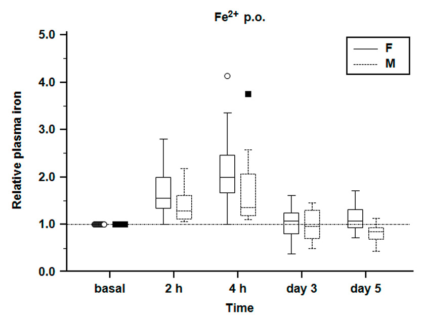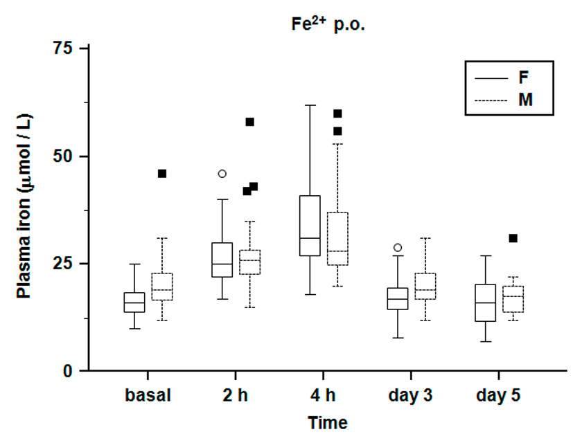 Absolute plasma iron concentration. Box and whiskers plot representing the median, first and third quartiles and the range of plasma iron concentration after ingestion of bivalent ferrous fumarate. Outliers are shown as circles (females) and squares (males).