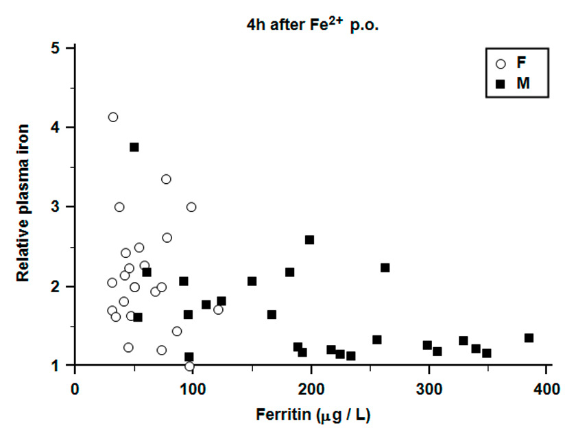 On days 3 and 5, we found values for all tested parameters comparable to the initial values. Correspondingly, blood sampling was stopped on days 3 and 5 after analysing the values of 35 subjects. There was no significant increase of plasma iron during observation time of four hours after ingestion of trivalent iron in fasting condition or in volunteers not receiving iron (see figs S1 and S2 [supplement]). A negative correlation between ferritin and relative iron increase could be detected in males (r = –0.51, p = 0.008) but not in females (r = –0.17, p = 0.4); females showed lower ferritin values than males (p <0.0001) in general and a wider variation of iron increase (fig. 4).