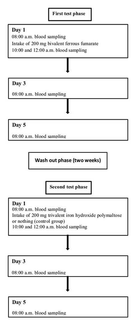 Each of the 49 volunteers received, in a first test phase, 200 mg of solid bivalent ferrous fumarate in fasting condition after blood samples were drawn for plasma iron, ferritin, soluble transferrin receptor (sTfR), haemoglobin (Hb), reticulocytes (Ret) and reticulocyte-haemoglobin (Ret-He). Two and four hours later, as well as on days 3 and 5, plasma iron, Hb, Ret and Ret-He were measured, all in fasting condition. Relative plasma iron concentration was calculated in relation to the concentration before iron ingestion, which is defined as 1.0. Haematocrit did not differ relevantly among all measurements. Therefore, no adjustments were necessary. The measurement at days 3 and 5 was performed in 35 persons only as all mentioned parameters were found to be comparable to initial values. After a wash-out phase of two weeks, 23 healthy volunteers proceeded to a second test phase to receive trivalent iron hydroxide polymaltose in fasting condition and 11 healthy volunteers did not receive iron and, thus, served as a negative control. In these latter two groups the identical laboratory analyses were performed in this second test phase. The study design is summarised in figure 1.