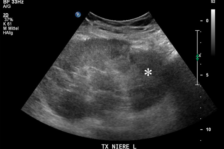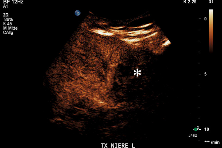 Transplanted kidney with hypoechoic region at the lower pole (*) on B-mode ultrasound (A). Corresponding CEUS imaging with devascularised region at the lower pole (*) in the transplanted kidney (B).