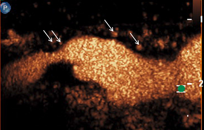 In CEUS imaging of the carotid artery, the plaques and the intima-media complex appear hypoechoic, whereas the carotid lumen and the adventitial layer appear enhanced. This improves visualisation of vessel wall irregularities including soft plaques and plaque ulcerations [16]. In a recent prospective study in asymptomatic patients with cardiovascular risk factors, CEUS showed additional value for the detection of subclinical atherosclerosis in the carotid arteries [17]. The atherosclerotic plaques that were detected by CEUS but not with standard carotid ultrasound were predominantly hypoechogenic. The authors concluded that CEUS may have an incremental value for the detection of subclinical atherosclerosis, particularly in the carotid arteries.