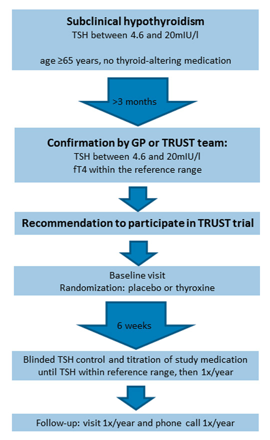 With the aim to resolve these uncertainties regarding the risks and benefits of treatment on relevant clinical outcomes in elderly persons with subclinical hypothyroidism, the first adequately powered RCT has been initiated [58]. The TRUST Study (Thyroid hormone Replacement for Untreated older adults with Subclinical hypothyroidism: a randomised placebo-controlled Trial) is a European multicentre study that is conducted in five centres in four European countries including Switzerland, Scotland, Ireland and The Netherlands, and examines thyroid hormone replacement therapy versus placebo in elderly individuals with persisting subclinical hypothyroidism (www.trustthyroidtrial.com). A total of 3,000 participants will be enrolled in all sites. Participating centres in Switzerland include the Inselspital Bern and the University Hospital of Lausanne that are both supported by the local institutes of family medicine, BIHAM (Berner Institut für Hausarztmedizin) and IUMG (Institut universitaire de médecine générale) in Lausanne, with a large number of participants recruited in general practices (fig. 1). A broad population of community-dwelling individuals aged 65 years or older with persistent subclinical hypothyroidism, defined as a TSH level 4.6 to 19.9 mIU/l measured on two or more occasions at least three months apart with normal fT4 levels, are included in the study to ensure a good generalisability of the study results and allow direct conclusions for clinical decisions that need to be taken by GPs. To meet this aim, only few exclusion criteria have been defined: these include patients on thyroid-altering medication, recent thyroid surgery or radio-iodine therapy within the last year, grade IV NYHA heart failure, recent hospitalisation for major illness to exclude patients with euthyroid sick syndrome, a prior clinical diagnosis of dementia, and acute coronary syndrome within the last four weeks. The participants are randomised to either placebo or levothyroxine with a starting dose of 50 µg daily (25 µg in patients with a weight <50 kg or a history of CHD) and with subsequent dose adjustments according to the serum TSH level. Participants are followed for one to four years to reach the target number of cardiovascular outcomes, and a number of relevant multimodal clinical outcomes are assessed: primary outcomes include fatal and non-fatal cardiovascular events, and disease-specific quality of life, secondary outcomes are muscle strength, blood pressure, cognitive function, functional capacity, general quality of life, and mortality.