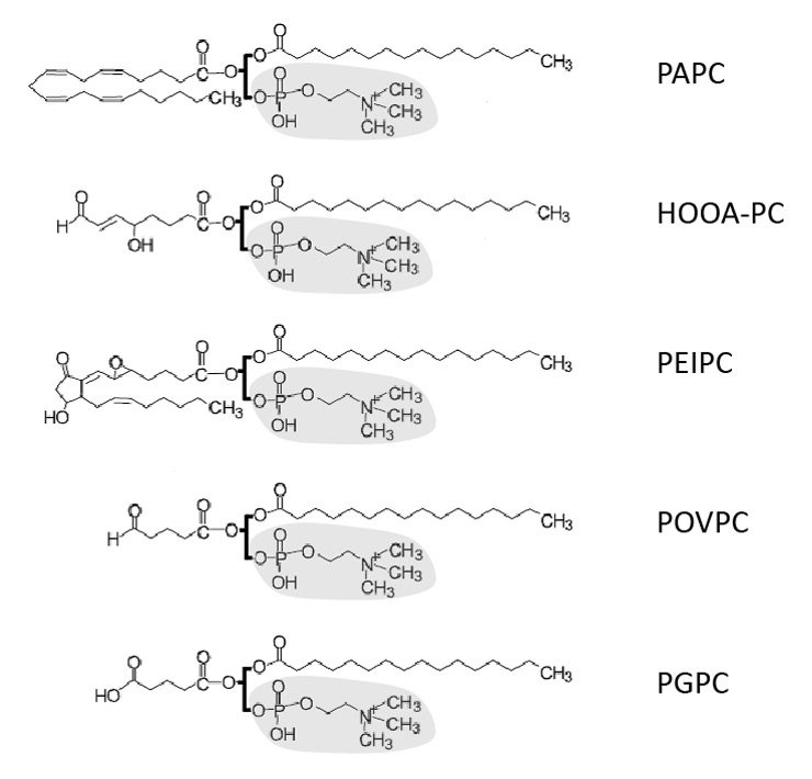 Chemical structure of some biologically active oxidised phospholipids. The image shows molecular structures of a non-oxidised phospholipid 1–palmitoyl-2–arachidonoyl-sn-glycero-3–phosphocholine (PAPC) and some of its oxidised derivatives: 5–hydroxy-8–oxo-6–octenoyl-phosphocholine (HOOA-PC), 1–palmitoyl-2–(5,6–epoxyisoprostane E2)-sn-glycero-3–phosphocholine (PEIPC), 1–palmitoyl-2–(5–oxovaleroyl)-sn-glycero-3–phosphocholine (POVPC) and 1–palmitoyl-2–glutaroyl-sn-glycero-3–phosphocholine (PGPC). Bold lines, glycerol “backbones”; shadow, polar head groups.