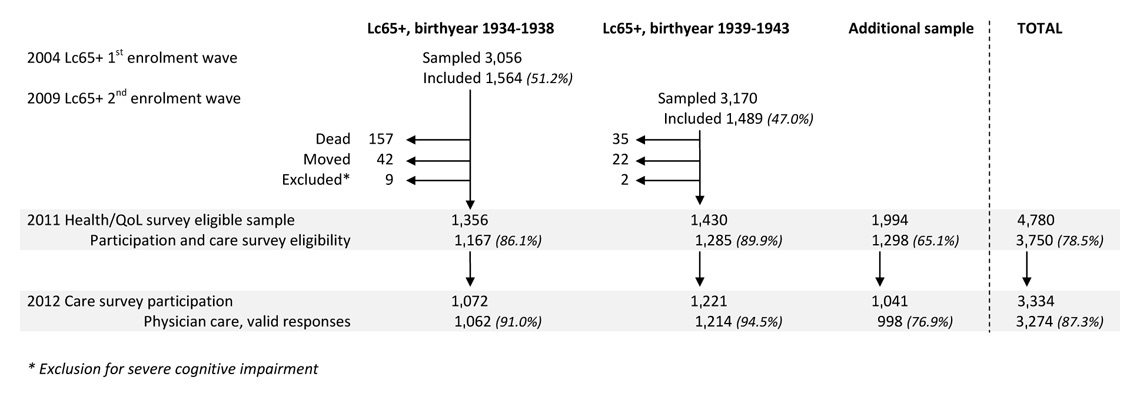 The flow chart in figure 1 summarises the sampling procedure. The Lc65+ study was designed to study frailty in old age [17]. It started in 2004 with the random selection of 3,056 persons born between 1934 and 1938 from the Lausanne city population register (initial participation n = 1,564, 51.2%). In 2009, a second random sample of 3,170 people born between 1939 and 1943 joined the Lc65+ study (initial participation n = 1,489, 47.0%). Birthyear and sex were not associated to the participation in Lc65+ and socio-economic characteristics of participants (e.g., nationality, marital status, living arrangement) closely reflected the structure of the same age Lausanne population from the last population census, excepted a slightly higher participation of persons in the highest level of education.
