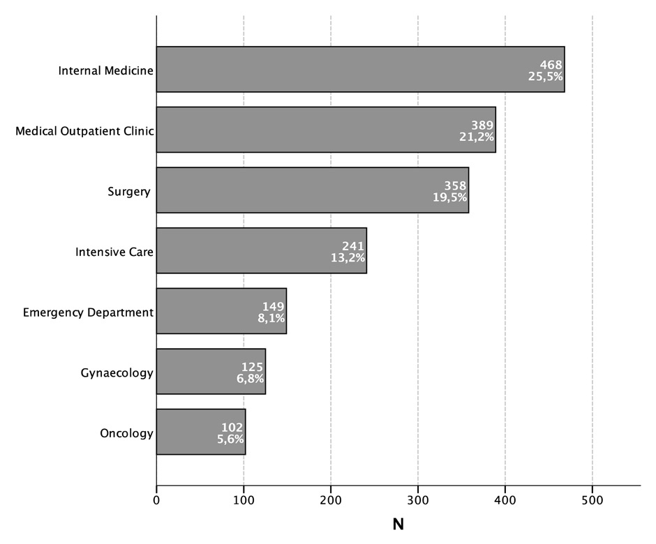 | Internal medicine | Gynaecology | Oncology | Emergency department | Surgery | Intensive care | Medical outpatient clinic | All | |