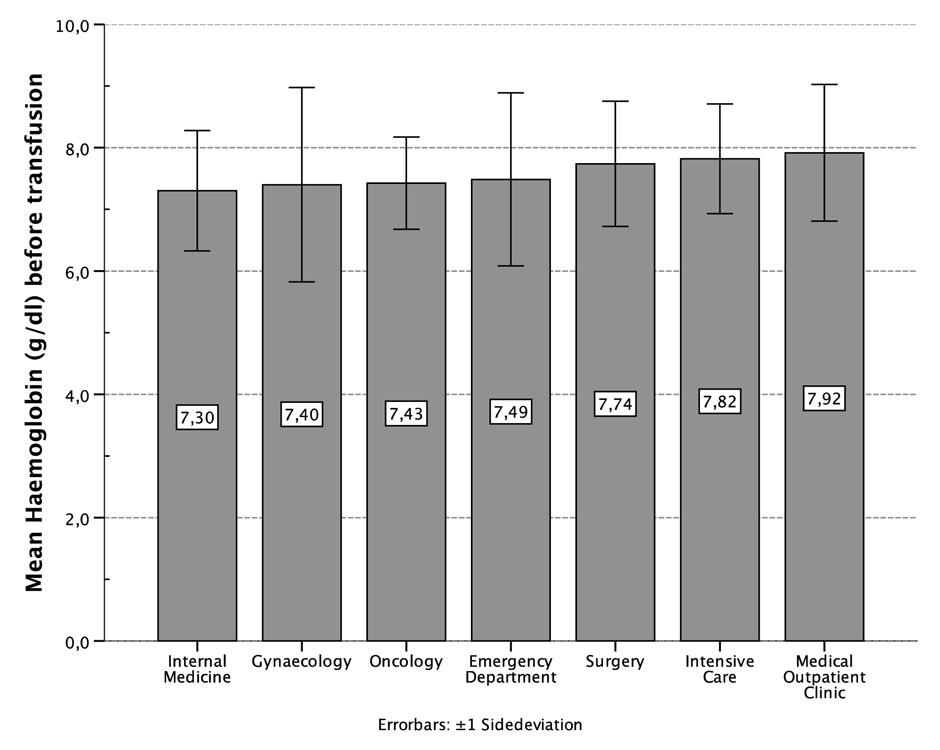 Mean haemoglobin (g/dl) before transfusion, distributed by departments.