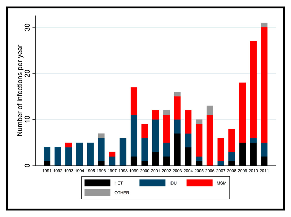 The landscape of HCV epidemiology in HIV-infected patients has changed in recent years due to the increasing role played by its sexual transmission in MSM and the decreasing incidence in injection drug use in PWID. In the context of successful harm reduction strategies for PWID in Switzerland, the number of HCV-infected patients entering HIV care has decreased in recent years, whereas the number of incident HCV infections during follow-up has increased. The new epidemic of HCV infections in HIV-infected MSM and the potentially increased sexual transmission of HCV reported in cohorts of HIV-infected women [49] raised the question of whether sexual transmissions of HCV could also occur in HIV-uninfected individuals.