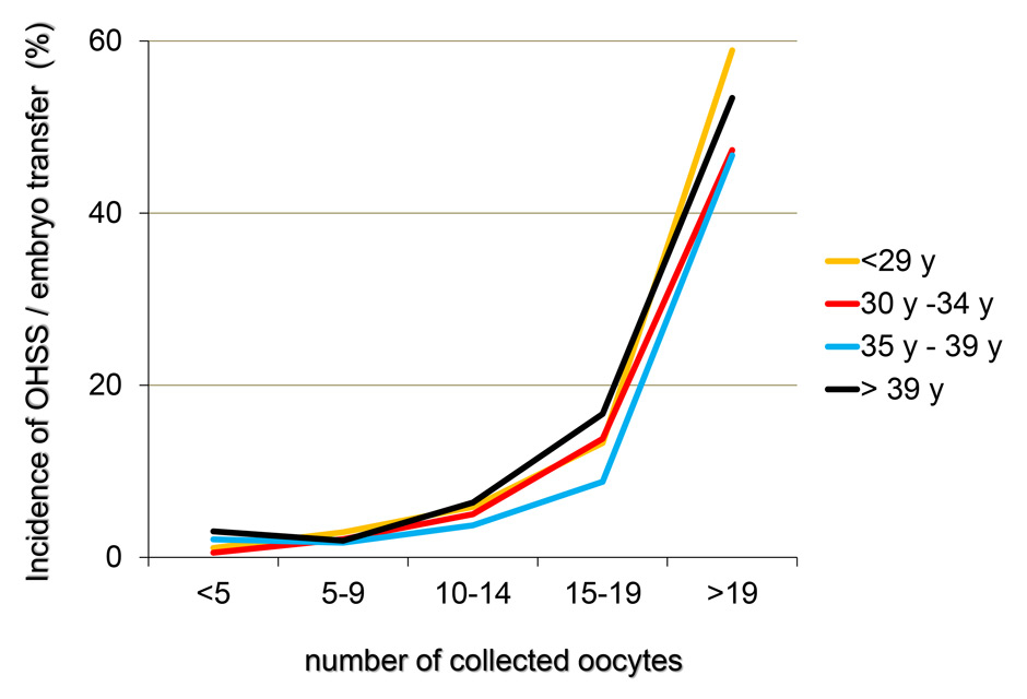 A‒C The incidence of OHSS per initiated controlled ovarian hyperstimulation (in %, panel A), the cancellation rate per initiated cycle and the incidence of OHSS per embryo transfer (in %, panel C) taken from the pooled FIVNAT-CH data collected between 2005 to 2012 were computed in relationship to the number of collected oocytes and the age of the treated infertile patients. The incidence of OHSS rises significantly if more than 14 oocytes are collected. In 17.8% of all treatment cycles in which 19 or more oocytes were collected embryo transfer was cancelled to avoid OHSS. Among all age groups, the cancellation rate was the highest when fewer than five oocytes or 19 or more oocytes were collected (panel B).