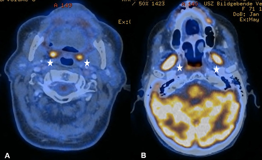 (A) Increased uptake in the right parotid gland in a 56-year old patient with a past medical history of radical parotidectomy and adjuvant radiation therapy (RT) on the left side due to a parotid gland carcinoma. Physiological uptake in the cervical brown fat tissue and the floor of mouth (FOM) muscles. (B) Increased uptake in the left paramedian FOM muscles due to muscular dysbalance in a 69-year old patient with a past medical history of surgical resection and RT of a right-sided base of the tongue carcinoma
