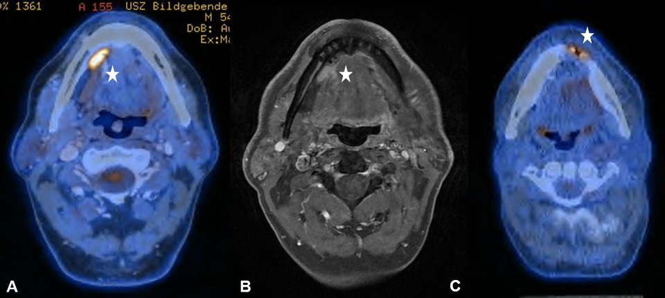 Post-treatment surveillance of head and neck cancer (HNC) requires periodic clinical and radiological examinations to exclude persistence or recurrence of locoregional disease, distant metastases or secondary tumours. Despite aggressive multimodal therapy regimens, locoregional recurrence appears in up to 40%, whereby most recurrences occur within the first 2 years after primary treatment [1–3]. In recent years, (18F)fluoro-deoxy-D-glucose (FDG) positron emission tomography (PET) – computed tomography (CT) has become a valuable tool in post-treatment surveillance, which provides information on the metabolic activity and the anatomical localisation of the locoregional tumour site and therefore is superior in certain cases to conventional imaging modalities, such as PET, CT or magnetic resonance imaging (MRI) [4–7]. This is especially true for PET-negative conditions, since the negative predictive value has been demonstrated to be consistently high (>90%) and therefore negative periodic clinical examinations may be complemented by PET-CT [8]. However, there are various non-malignant FDG-positive conditions, which may cause increased FDG uptake, resulting in a positive predictive value (PPV) of only 64–77% in detecting locoregional persistence or recurrence [8, 9]. Being confronted with this high number of false-positive results, interpretation of PET-CT is challenging and can result in potentially unnecessary investigations, interventions and patient uncertainty. With the recent introduction of PET-MRI, several of those challenging cases in PET-CT might be solved on the basis of the unmatched soft tissue contrast and partly less susceptibility to dental artefacts [10–12].