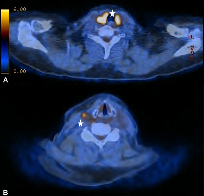 (A) Diffuse bilateral uptake in the thyroid without any morphological correlate in a 67-year old patient with no clinical, ultrasonographical or laboratory signs of thyroid dysfunction. (B) The same patient with corresponding probable reactive lymphadenopathy.