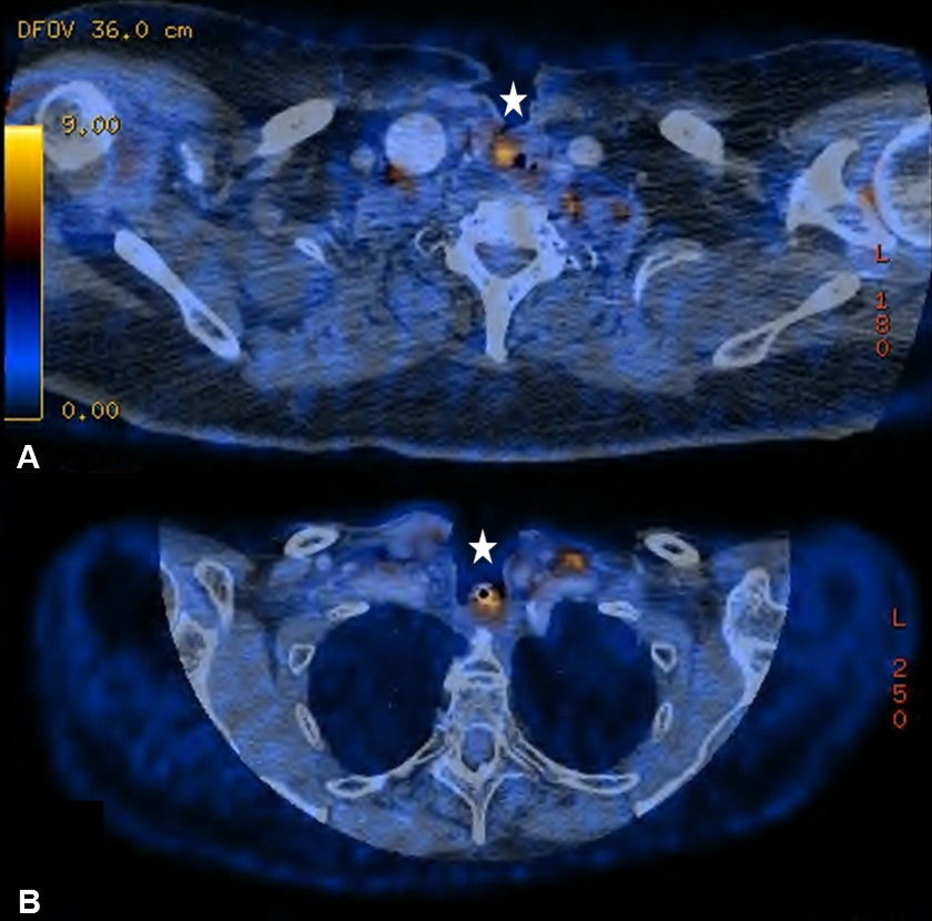 (A) Increased uptake around inserted voice prosthesis in a 74-year old patient with a past medical history of total laryngectomy and radiation therapy (RT) due to a transglottic larynx carcinoma. (B) Seventy-one year old patient after total laryngectomy, partial thyroidectomy and RT with increased uptake around the tracheostoma.