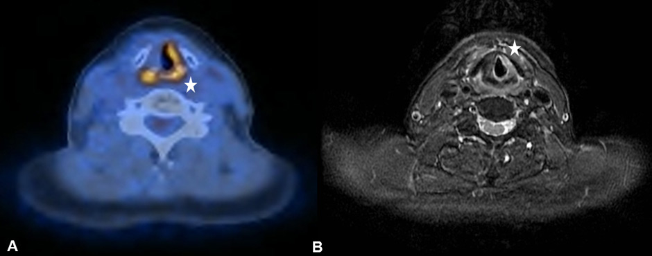 (A) Compensatory uptake in the left vocal cord in a 59-year old patient with known right unilateral vocal cord immobility due to a transglottic larynx carcinoma. (B) The corresponding T2-weighted magnetic resonance imaging examination helps to better delineate the immobile right vocal cord by providing superior soft-tissue contrast.